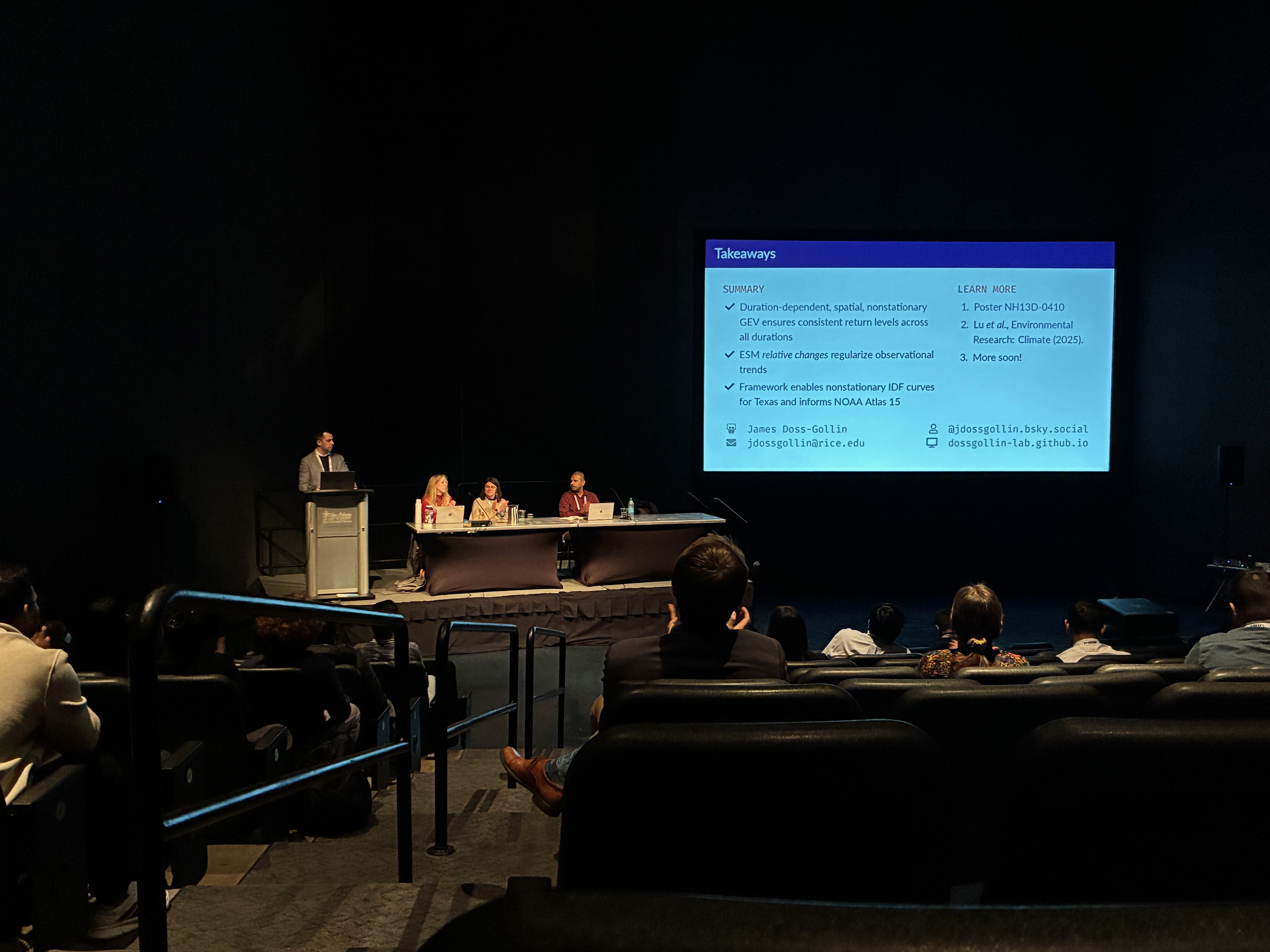 James Doss-Gollin delivered a talk titled “TxRain: A Bayesian framework for integrating historical observations and model projections to develop nonstationary IDF curves” (H24A-07). This work addresses the challenge of developing nonstationary extreme rainfall models by integrating accurate but short weather station records with long-term climate model projections. James was also a coauthor on several other presentations at the conference.