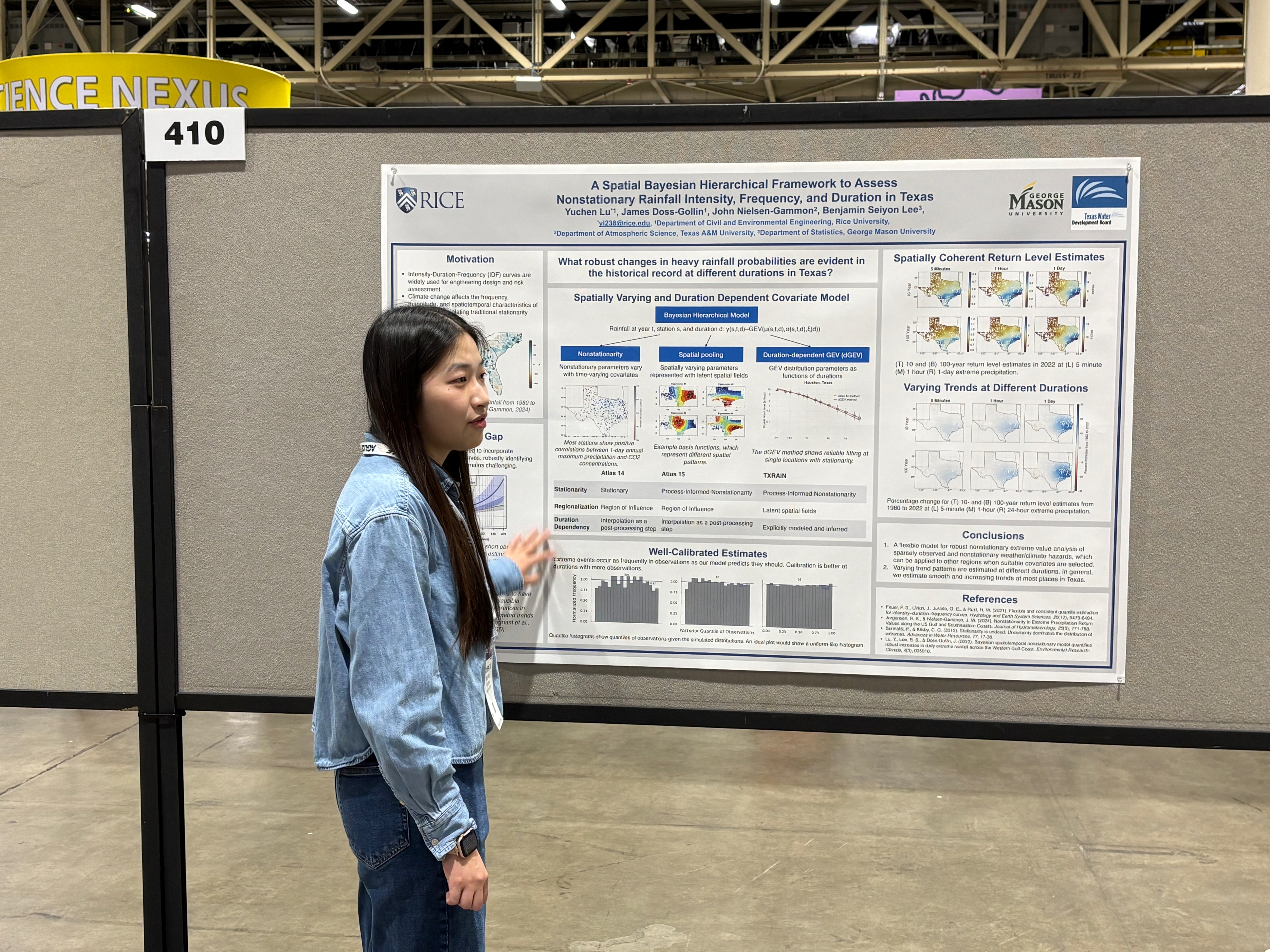 Yuchen Lu presented a poster titled “A Hierarchical Bayesian Spatial Framework to Assess Nonstationary Rainfall Intensity, Frequency, and Duration in Texas” (NH13D-0410). The work proposes a hierarchical Bayesian spatial model that efficiently pools information across space and jointly models precipitation across multiple time durations, enabling nonstationary IDF curve analysis across Texas.